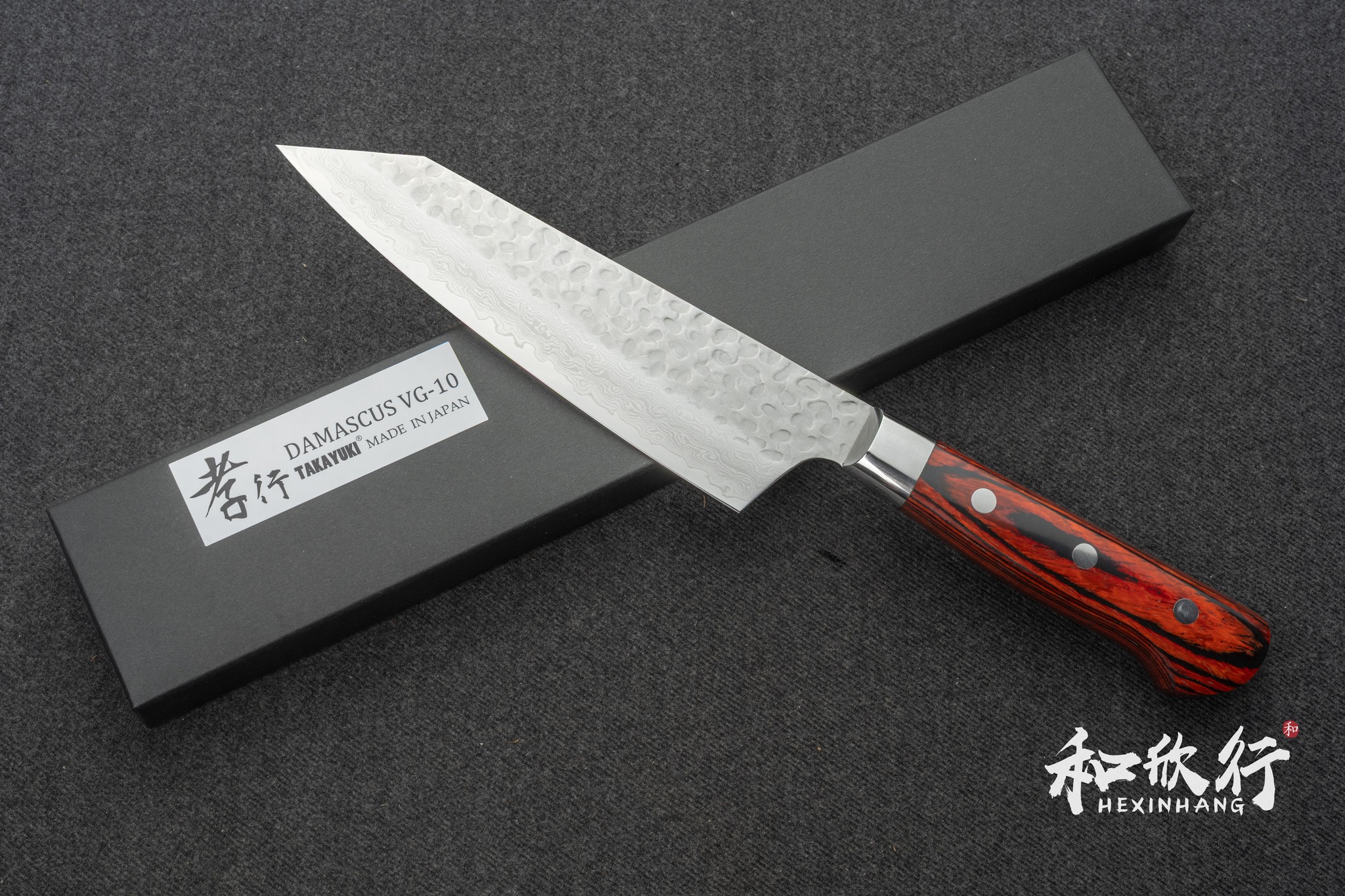this Sakai Takayuki 33-Layer Hammered Damascus Kiritsuke Santoku 160mm